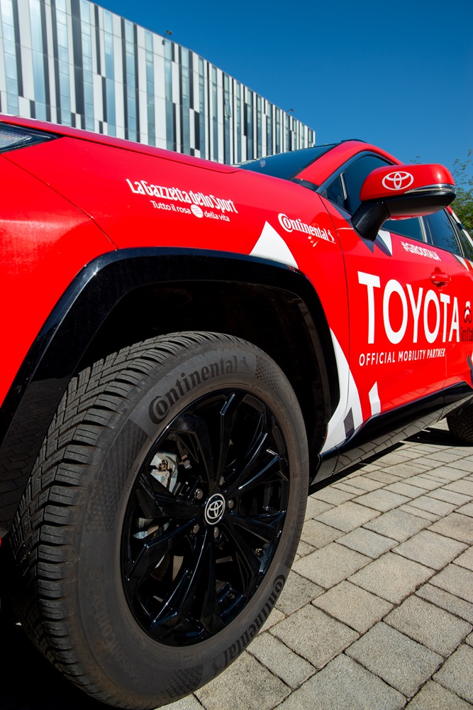 La flotta Toyota, sarà equipaggiata con pneumatici Continental: a svolgere il ruolo di protagonista al Giro sarà il nuovo AllSeasonContact 2, un prodotto vettura di ultima generazione perfetto per i veicoli elettrici, come certificato dalla marcatura EV sul fianco, e ai vertici del mercato per chilometraggio, bassa resistenza al rotolamento e sicurezza in ogni condizione meteorologica.